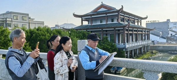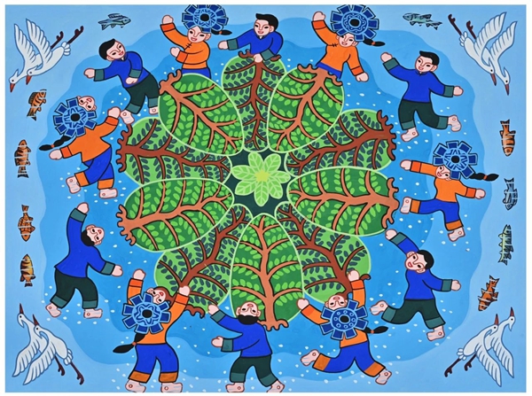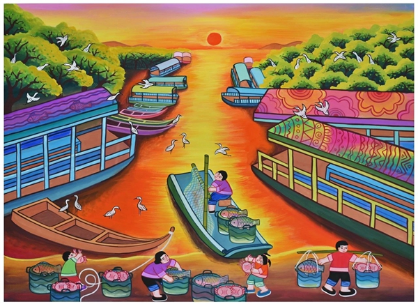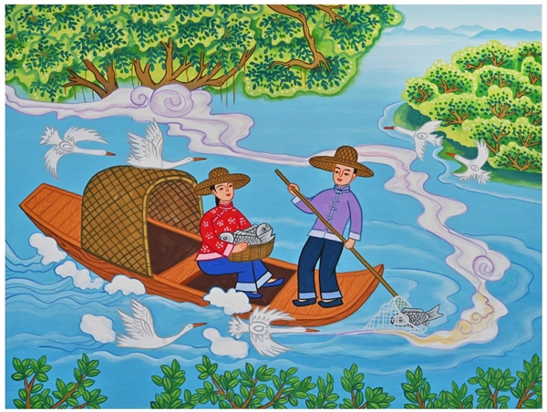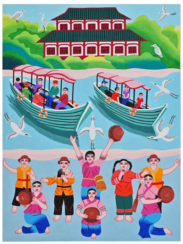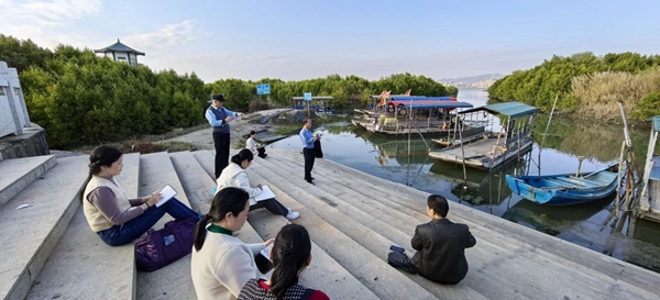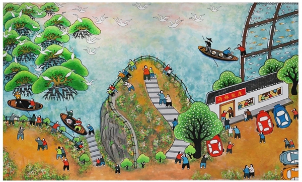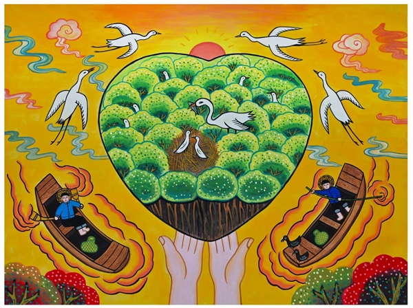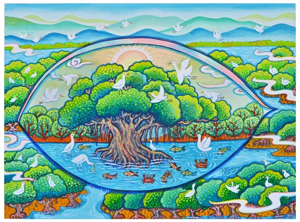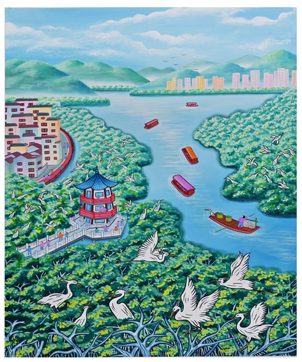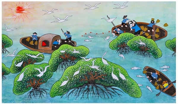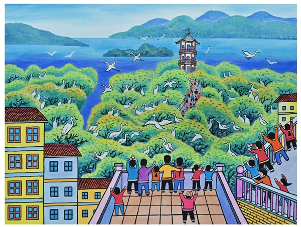 习近平总书记指出,红树林是“国宝”,要像爱护眼睛一样守护好。怀着对红树林的珍爱之情,2月26日,惠州学院美术与设计学院的师生与9位龙门农民画非遗传承人携手,深入惠东县红树林湿地?;で共煞缧瓷疃?。他们用多彩的画笔,记录下红树林的生态风貌与人文风情,最终创作出了用于“红林守护·艺绘生态”龙门农民画红树林生态主题展的作品。