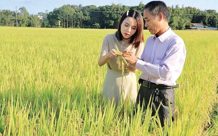 邹颖(左一)检查水稻生长情况。